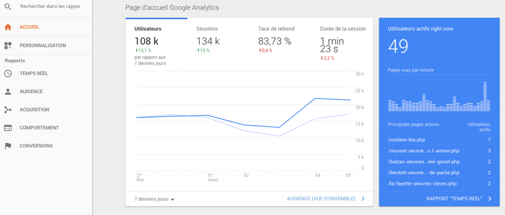 Google Analytics permet d’analyser l’audience d’un site internet. Tableaux et graphiques vous fournissent les données de manière très accessible et complète. Il suffit d’ouvrir un compte gratuit pour avoir accès à tous ces services. L’ analyse du trafic est particulièrement importante, notamment pour améliorer son site et sa stratégie webmarketing. L’outil de Google vous donne accès à de multiples informations :